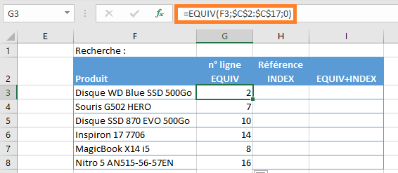 La fonction EQUIV permet de trouver le numéro de ligne où se trouve une donnée.